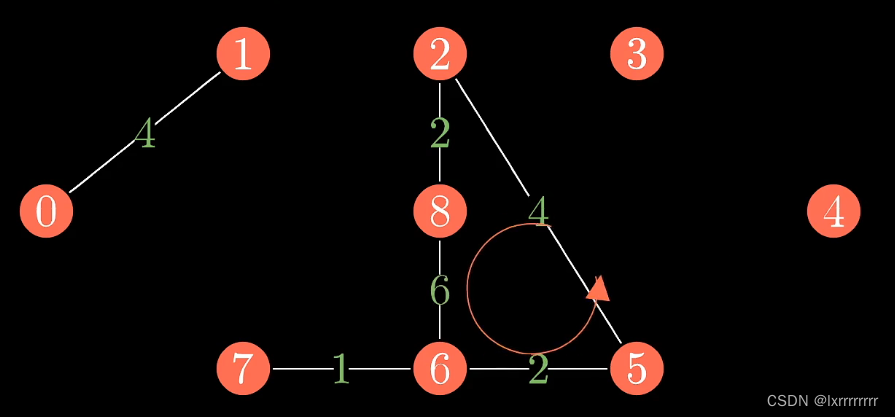 在加入第五条边时,我们发现原图出现了环,我们就舍弃这条边