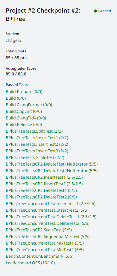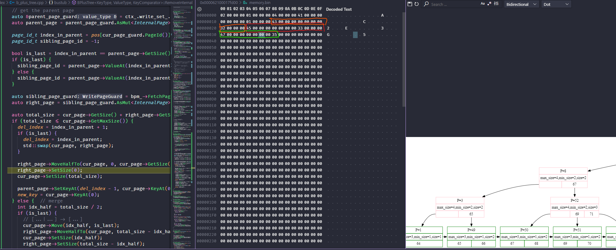 - 这里我遇到了 heap overflow 的问题,最终通过将 B+Tree 初始化时设置的 leaf_node 的大小更改了一下,默认情况下好像是有可能 internal_max_size 和 leaf_max_size 可以一样的,但是考虑极端情况,这个值很大,因为 leaf_pag header 比 internal_page 的 header 多出来 4 个字节,所以 leaf_max_size 最大值我感觉应该不超过 internal_max_size - 1