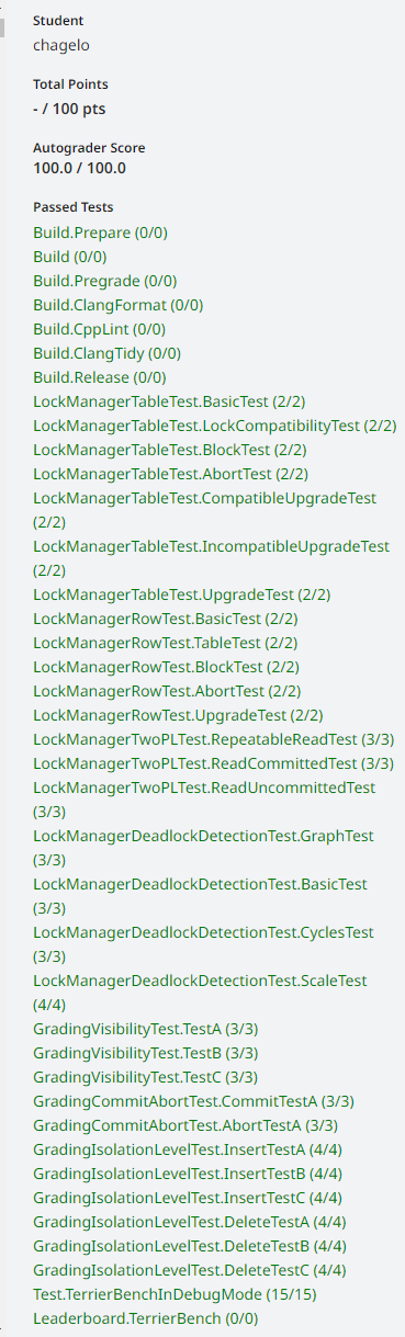 - 判断兼容性。遍历请求队列,查看当前锁请求是否与所有的已经 granted 的请求兼容。需要注意的是,在我的实现中 granted 请求不一定都在队列头部,因此需要完全遍历整条队列。锁兼容矩阵可以在 Lecture slides 中查看。若全部兼容,则通过检查。否则直接返回 false。当前请求无法被满足。