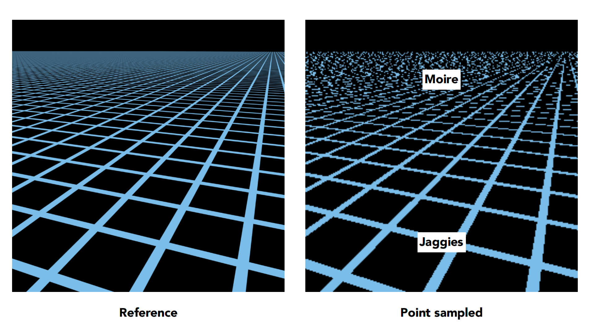 - 远处有摩尔纹,近处有锯齿。