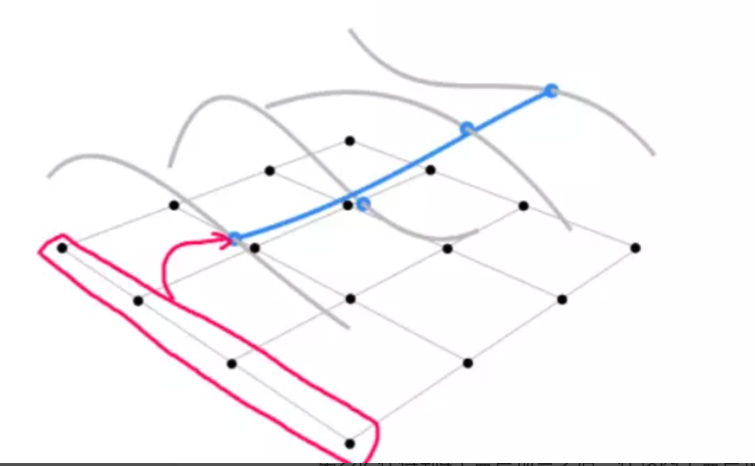 - 第2步 在得到4个蓝色顶点之后,在这四个蓝色顶点的基础之下利用第二个参数 v vv 便可以成功得出贝塞尔曲面上的正确一点