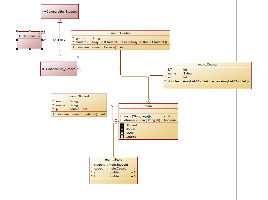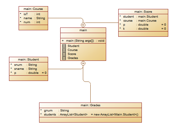 思路:设计学生类,属性有学号String snum,姓名String sname,总课程平均分double p;课程类,属性有int isT课程类型(1必修,2选修,3实验),课程名称String name,课程考察方式int num(1为考试,2为考察,3为实验),每次实验的成绩权值ArrayList<Double> doubles =new ArrayList<Double>();;成绩类,属性有Student student学生类对象,Course course课程类对象,平时成绩double p,考试成绩double k;班级类,属性有String gnum班级名称,ArrayList<Student> students学生类对象集合。