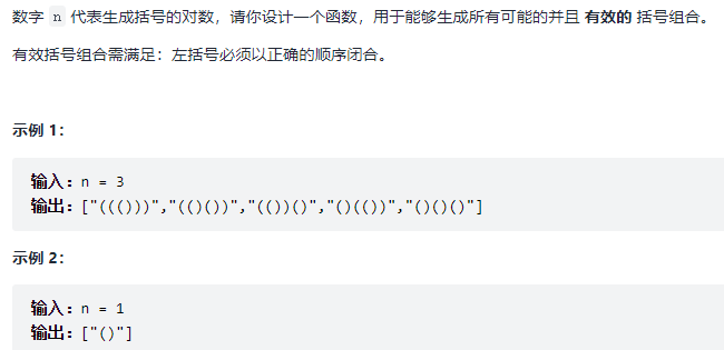 class Solution { public List<String> generateParenthesis(int n) { List<String> result = new ArrayList<String>(); generateAll(new StringBuilder(),result,0,0,n); return result; } public void generateAll(StringBuilder cur, List<String> result, int left, int right, int pos){ //递归出口 if(cur.length() == pos*2){ result.add(cur.toString()); return; }else { if(left<pos){//左括号共n个,如果当前还有左括号剩余 cur.append('('); generateAll(cur,result,left+1,right,pos); cur.deleteCharAt(cur.length()-1);//还原,以备当前位置添加右括号的情况 } if(right < left){ cur.append(')'); generateAll(cur,result,left,right+1,pos); cur.deleteCharAt(cur.length()-1); } } } }