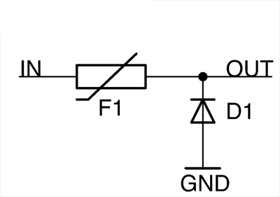 这样当外接电源反接时,二极管就被击穿了,从而保护电路模块中更为贵重的元器件,而二极管的成本还不到一毛钱,维修的时候直接更换一个就可以,当然,这样依然会造成电路板需要维修问题,为了提高可靠性,可以在二极管前面再串一个自恢复保险,当输入电压极性反向时,自恢复保险流过的电流过大将会熔断,避免了保护二极管的烧毁,当然,自恢复保险熔断需要一定的响应实现,大概100ms左右,这时候二极管本身存在过电流损坏的风险,所有这里最好选择功率二极管。