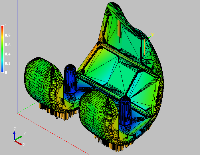 在OpenCADCADE中也提供了这样一个类AIS_ColorScale。如下为我的一个项目界面(读取stl网格,然后为每个顶点设定不同的颜色,颜色取值范围为0-1,每个定点的颜色根据其支撑强度计算颜色值,最后显示网格模型。该项目为3d打印工件创建支撑,可根据颜色计算不同的支撑立柱)。