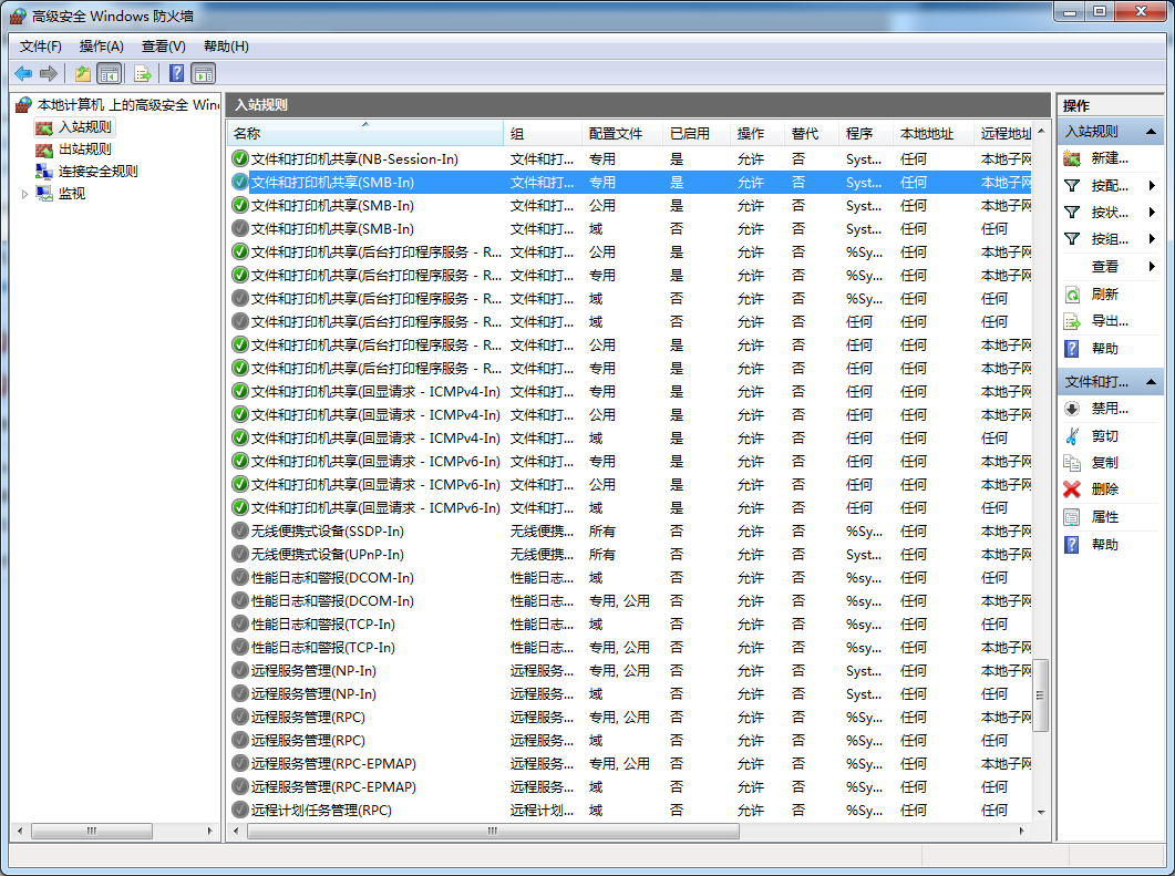 将“文件和打印机共享(SMB-In)”规则的“操作”从“允许”改为“阻止”。