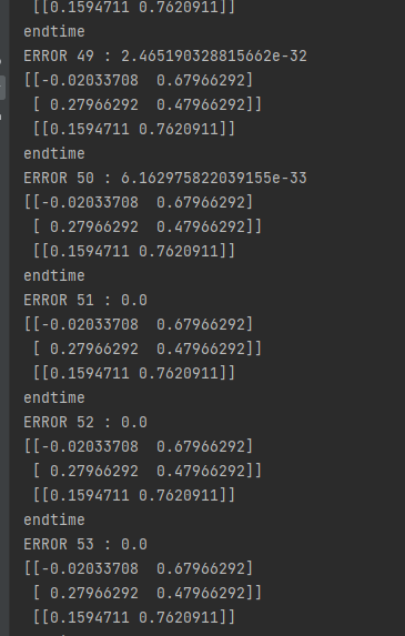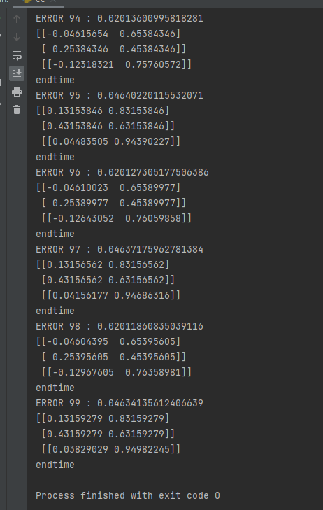 import numpy as np import math X = np.array([[0.35],[0.9]]) #输入层 #第二次输入值为[0.8],[0.9] y = np.array([[0.5]]) #输出值 #第二次输入值为[0.7] np.random.seed(1) min=9999 W0 = np.array([[0.1,0.8],[0.4,0.6]]) W1 = np.array([[0.3,0.9]]) print('original ',W0,'\n',W1) print('begin time ') for j in range(100): l0 = X l1 = np.dot(W0,l0) l2 = np.dot(W1,l1) l2_error = y - l2 Error = 1/2.0*math.pow(l2_error,2) print('ERROR',j,':',Error) l1_delta = l2_error * W1 W1+=l2_error*l1.T W0+=l1_delta.dot(l0) #print("Error:",Error) print(W0,'\n',W1) print('endtime')