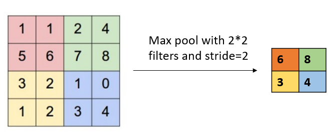 和卷积一样, 池化也有一个滑动的核, 可以称之为滑动窗口, 该图中滑动窗口的大小为 2 × 2, 步幅为 2, 每滑动到一个区域, 则取最大值作为输出, 这样的操作称为 Max Pooling. 还可以采用输出均值的方式, 称为 Mean Pooling.