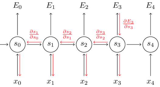 假设我们求 $$E_{}^{3}$$对v的偏导,这个相对好求,因为v的下一步就是$$E_{}^{3}$$ 于是: $$\frac{\partial E_{}^{3}}{\partial v}=\frac{\partial E_{}^{3}}{\partial y_{}^{3}}*\frac{\partial y_{}^{3}}{\partial s_{}^{3}}*\frac{\partial s_{}^{3}}{\partial v}$$ 假设某个输出结点要对w求偏导,他需要从该输出结点开始求,并一直迭代到最初那个结点。 假设我们求$$\frac{\partial E_{}^{3}}{\partial w}$$ 我们需要一层一层的求,即 $$\frac{\partial E_{}^{3}}{\partial W}=\frac{\partial E_{}^{3}}{\partial y_{}^{3}}*\frac{\partial y_{}^{3}}{\partial s_{}^{3}}*\frac{\partial s_{}^{3}}{\partial W}$$ 而 $$\frac{\partial s_{}^{3}}{\partial W}=\frac{\partial s_{}^{3}}{\partial y_{}^{2}}*\frac{\partial y_{}^{2}}{\partial s_{}^{2}}*\frac{\partial s_{}^{2}}{\partial y_{}^{1}}*\frac{\partial y_{}^{1}}{\partial s_{}^{1}}*\frac{\partial s_{}^{1}}{\partial y_{}^{0}}*\frac{\partial y_{}^{0}}{\partial s_{}^{0}}*\frac{\partial s_{}^{0}}{\partial w}$$ 最终得出结论: $$\frac{\partial E_{}^{3}}{\partial W}=\sum_{k=0}^{3} \frac{\partial E_{}^{3}}{\partial y_{}^{3}}*\frac{\partial y_{}^{3}}{\partial s_{}^{3}}*\frac{\partial s_{}^{3}}{\partial s_{}^{k}}*\frac{\partial s_{}^{k}}{\partial w}$$ 可能有人疑惑为什么变成求和的符号? 我们可以看出来 $$s_{}^{2}=\sigma (y_{}^{1}*w+u*x_{}^{2})$$ 在对w求偏导的过程中,上述式子中 $$y_{}^{1}里面也包含w,而y_{}^{1}又*w,在对其求偏导的过程中出现(y_{}^{1}+\frac{\partial y_{}^{1}}{\partial w})的情况$$ 因此出现加号求和,从而得出上述结论。 同理可得: $$\frac{\partial E_{}^{3}}{\partial u}=\sum_{k=0}^{3}\frac{\partial E_{}^{3}}{\partial y_{}^{3}}*\frac{\partial y_{}^{3}}{\partial s_{}^{3}}*\frac{\partial s_{}^{3}}{\partial s_{}^{k}}*\frac{\partial s_{}^{3}}{\partial u}$$ 上述只是对某一时刻的误差求偏导,若要改变总体的参数,则需把每个L的误差都求出来并且求和,得出最终结果,即: $$\frac{\partial E}{\partial v}=\sum_{t=0}^{}\frac{\partial E_{}^{t}}{\partial v}$$ $$\frac{\partial E}{\partial w}=\sum_{t=0}^{}\frac{\partial E_{}^{t}}{\partial w}$$ $$\frac{\partial E}{\partial u}=\sum_{t=0}^{}\frac{\partial E_{}^{t}}{\partial u}$$ 参考: [1]BPTT-RNN训练算法 https://blog.csdn.net/caihuanqia/article/details/106745947