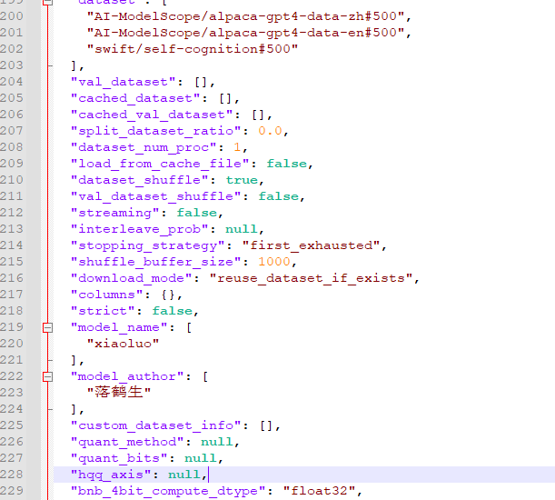 - 参数--model_author 落鹤生 --model_name 小落 这两个参数只有数据集路径最后为self-cognition才生效。