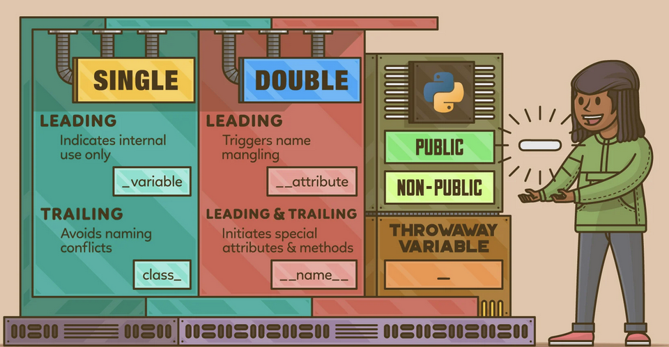 Dunder (Double UNDERscore) Alias Mark Jackson was the first to suggest dunder as a speech shorthand for double underscores (__) in a reply to a query from Pat Notz. Ned Batchelder later stressed the need for a way of pronouncing __: An awkward thing about programming in Python : there are lots of double underscores. [snip] My problem with the double underscore is that it's hard to say. How do you pronounce init__? "underscore underscore init underscore underscore"? "under under init under under"? Just plain "init" seems to leave out something important. I have a solution: double underscore should be pronounced "dunder". So __init is "dunder init dunder", or just "dunder init".