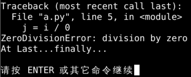 import traceback try: i = int("123") j = i / 0 except ValueError: print(ValueError) except NameError: print(NameError) except Exception as e: traceback.print_exc() else: print("Nothing Wrong") finally: print("At Last...finally...")