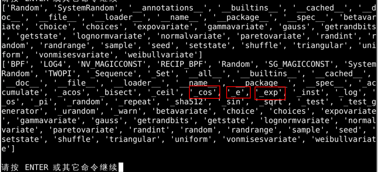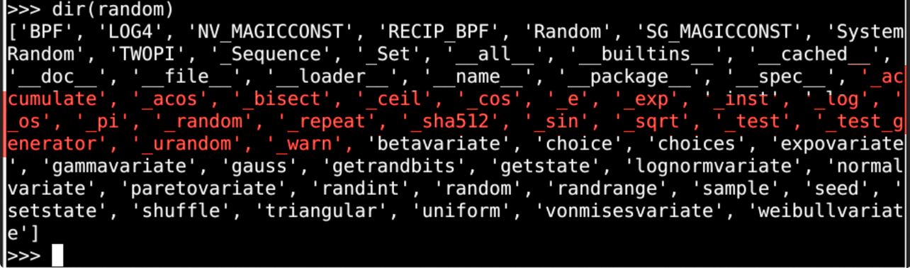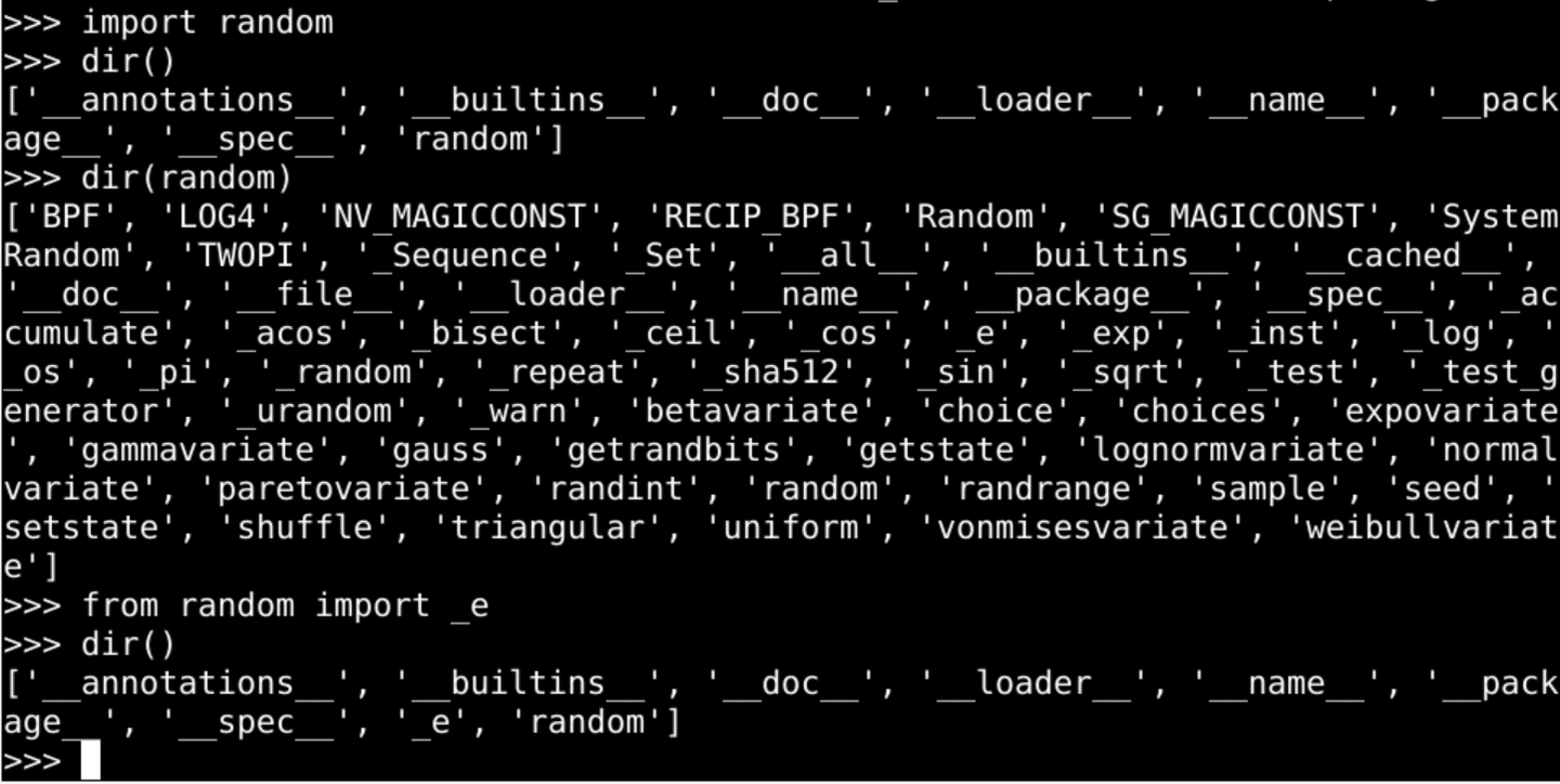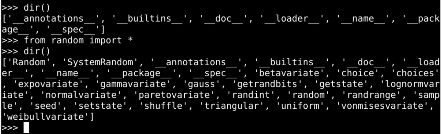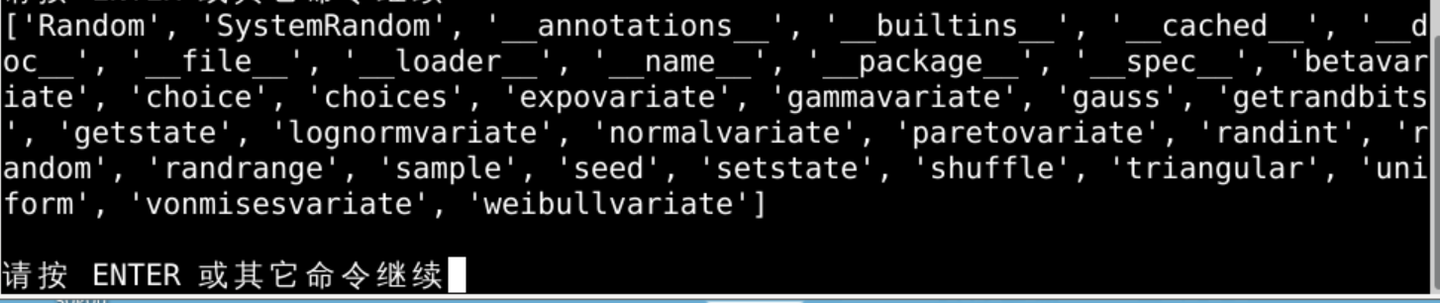 观察模块目录 from random import * print(dir()) import random print(dir(random))