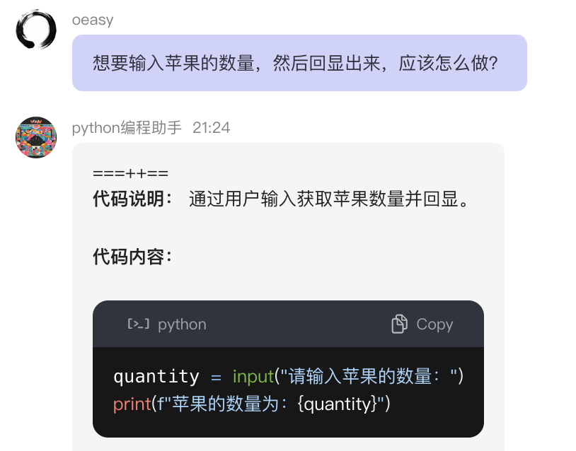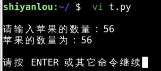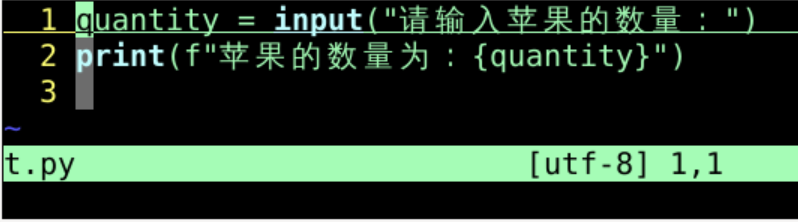 quantity = input("请输入苹果的数量:") print(f"苹果的数量为:{quantity}")