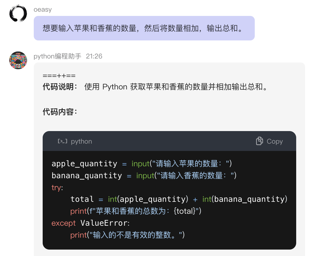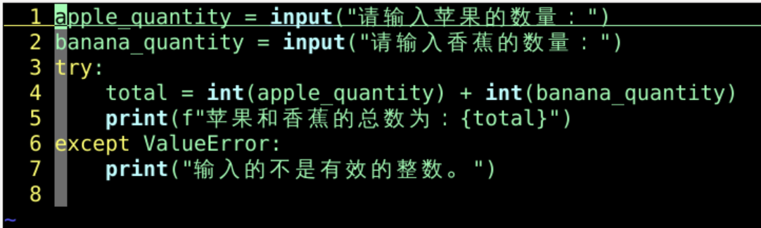 apple_quantity = input("请输入苹果的数量:") banana_quantity = input("请输入香蕉的数量:") try: total = int(apple_quantity) + int(banana_quantity) print(f"苹果和香蕉的总数为:{total}") except ValueError: print("输入的不是有效的整数。")