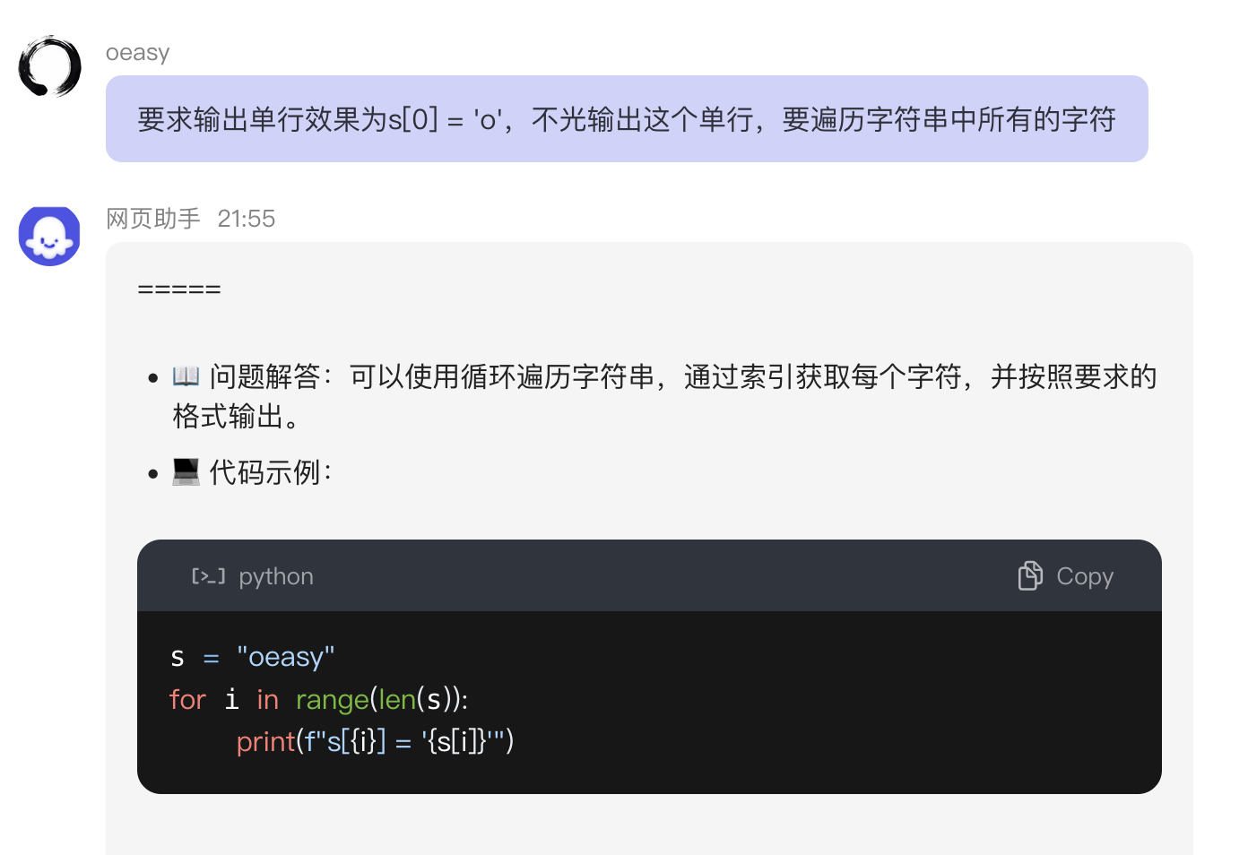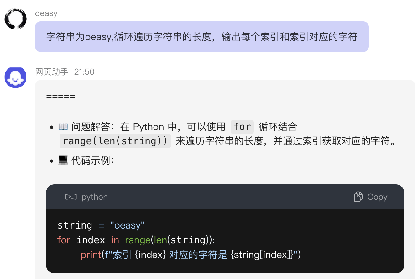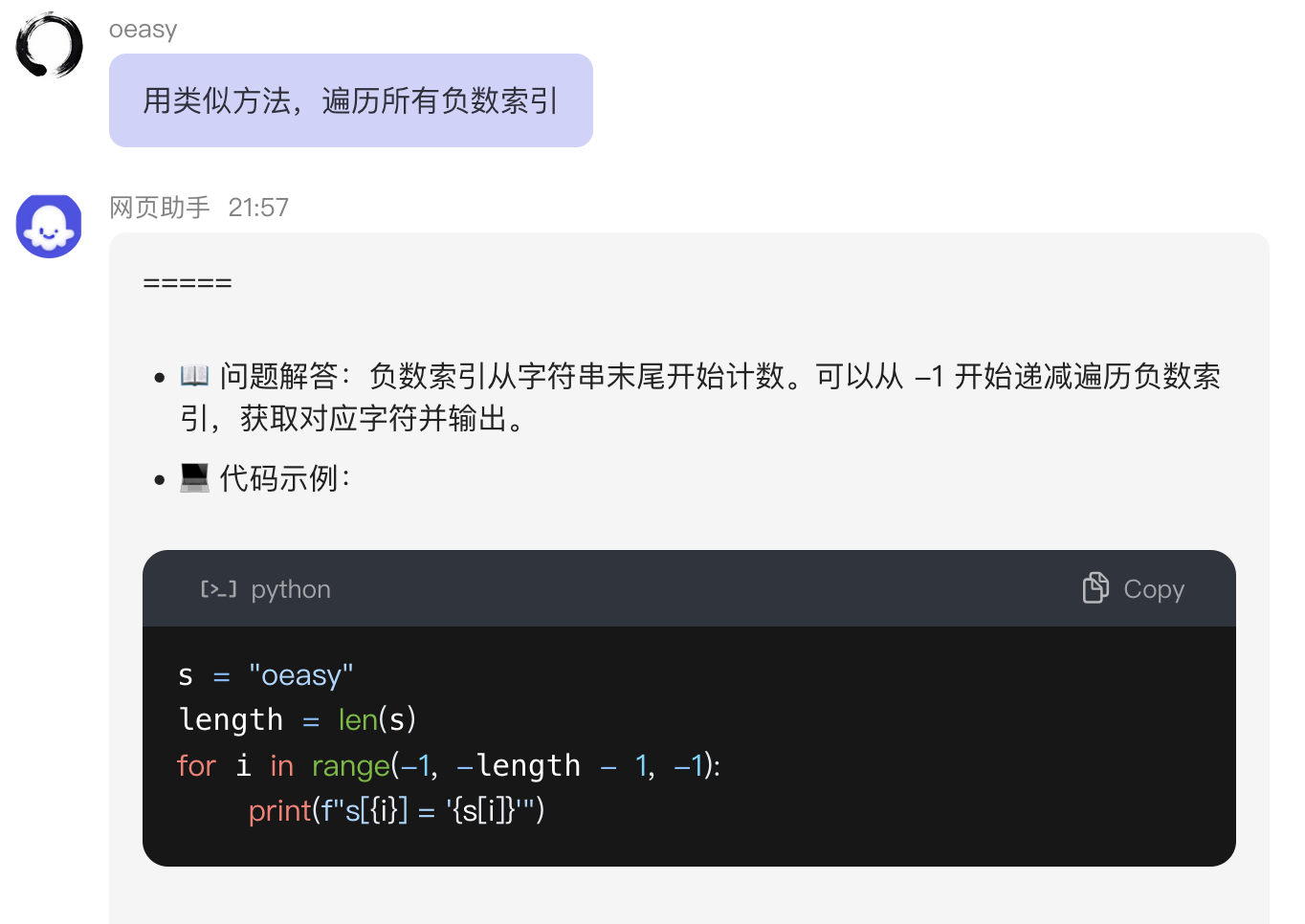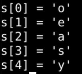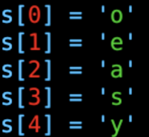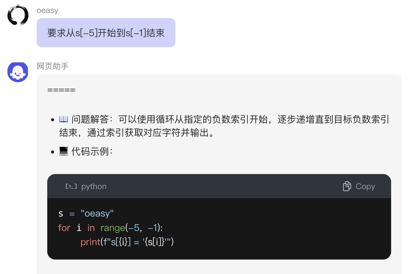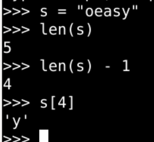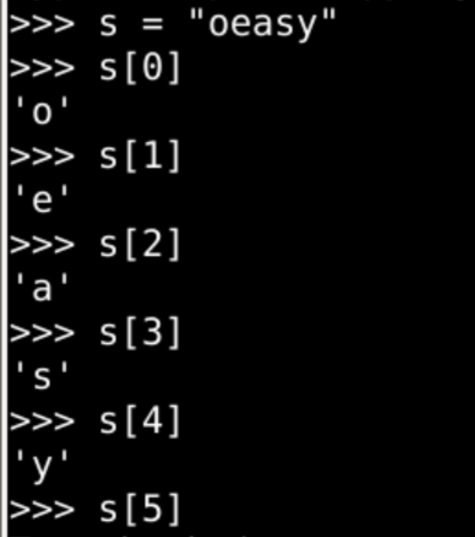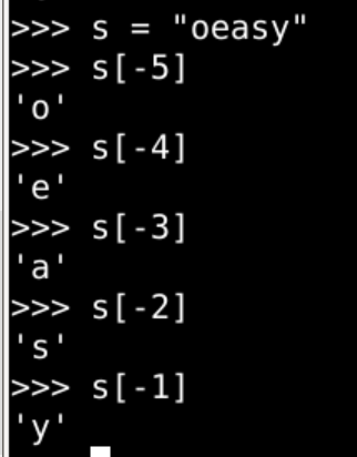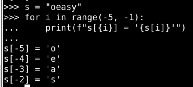 s = "oeasy" for i in range(-5, -1): print(f"s[{i}] = '{s[i]}'")
