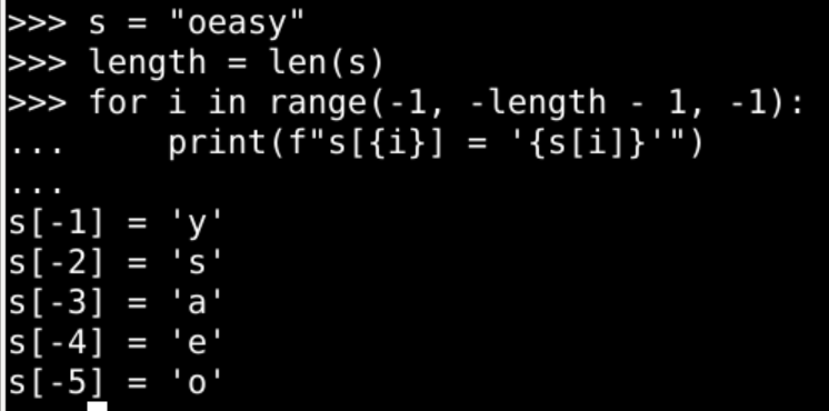 s = "oeasy" length = len(s) for i in range(-1, -length - 1, -1): print(f"s[{i}] = '{s[i]}'")