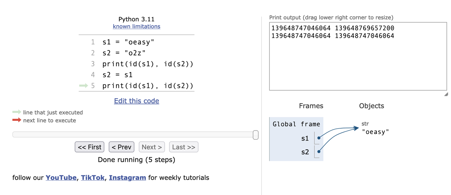 s1 = "oeasy" s2 = "o2z" print(id(s1), id(s2)) s2 = s1 print(id(s1), id(s2))