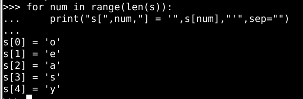 for num in range(len(s)): print("s[", num, "] = '", s[num],"'",sep="")