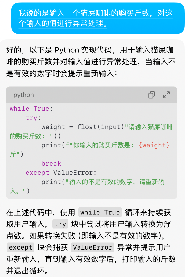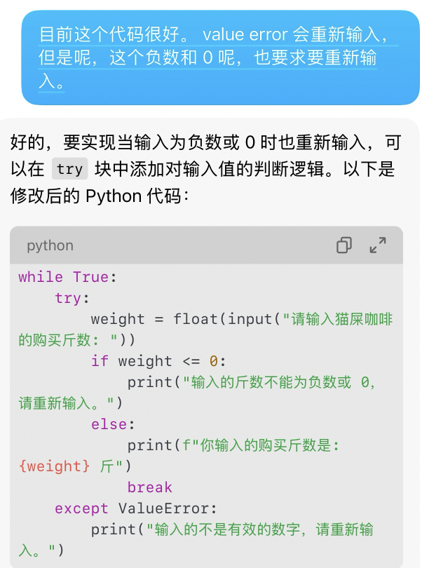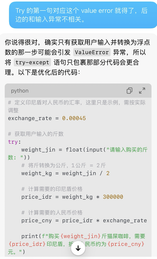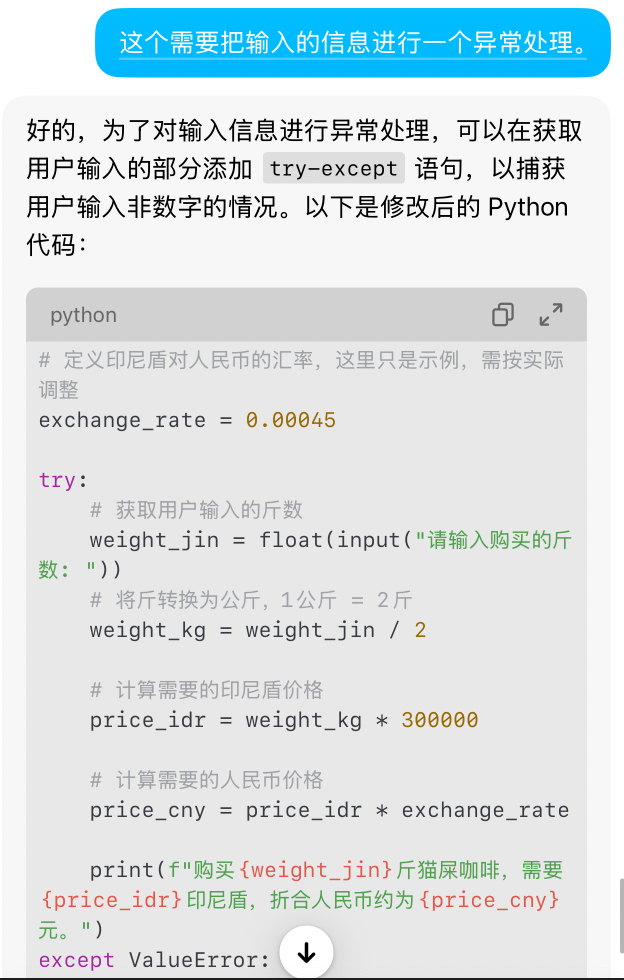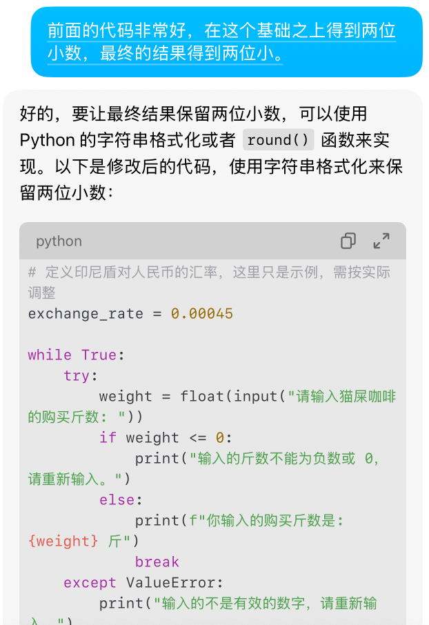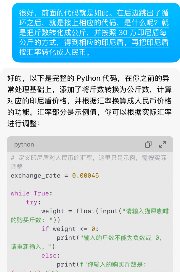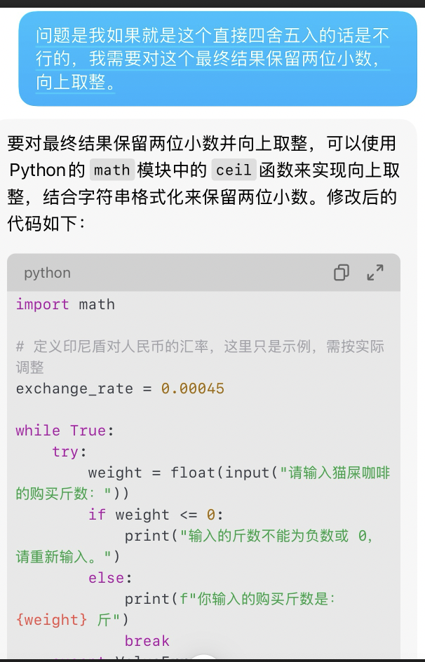 # 定义印尼盾对人民币的汇率,这里只是示例,需按实际调整 exchange_rate = 0.00045 while True: try: weight = float(input("请输入猫屎咖啡的购买斤数: ")) if weight <= 0: print("输入的斤数不能为负数或 0,请重新输入。") else: print(f"你输入的购买斤数是: {weight} 斤") break except ValueError: print("输入的不是有效的数字,请重新输入。") # 将斤数转换为公斤数,1公斤 = 2斤 weight_kg = weight / 2 # 计算对应的印尼盾价格,每公斤30万印尼盾 price_idr = weight_kg * 300000 # 计算对应的人民币价格 price_cny = price_idr * exchange_rate print(f"购买{weight}斤猫屎咖啡,共{weight_kg}公斤,需要{price_idr}印尼盾,折合人民币约为{price_cny}元。") 运行结果