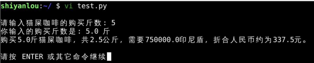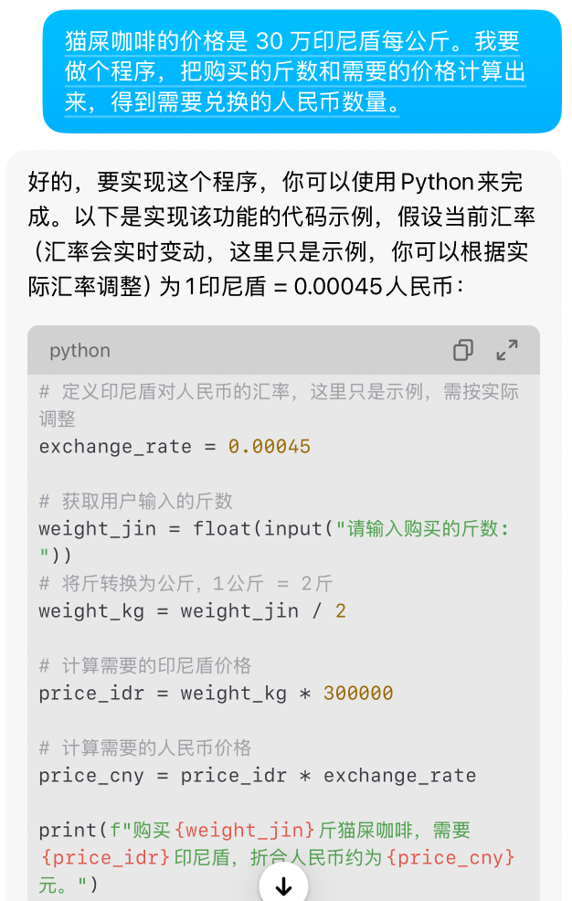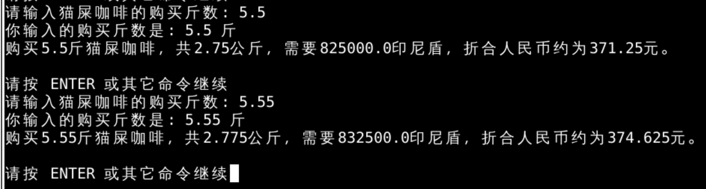 # 定义印尼盾对人民币的汇率,这里只是示例,需按实际调整 exchange_rate = 0.00045 while True: try: weight = float(input("请输入猫屎咖啡的购买斤数: ")) if weight <= 0: print("输入的斤数不能为负数或 0,请重新输入。") else: print(f"你输入的购买斤数是: {weight} 斤") break except ValueError: print("输入的不是有效的数字,请重新输入。") # 将斤数转换为公斤数,1公斤 = 2斤 weight_kg = weight / 2 # 计算对应的印尼盾价格,每公斤30万印尼盾 price_idr = weight_kg * 300000 # 计算对应的人民币价格 price_cny = price_idr * exchange_rate # 使用字符串格式化保留两位小数 print(f"购买{weight}斤猫屎咖啡,共{weight_kg}公斤,需要{price_idr:.2f}印尼盾,折合人民币约为{price_cny:.2f}元。")