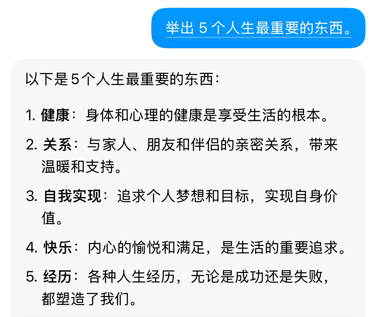 shopping_list = ["健康", "关系", "自我实现", "快乐", "经历"]