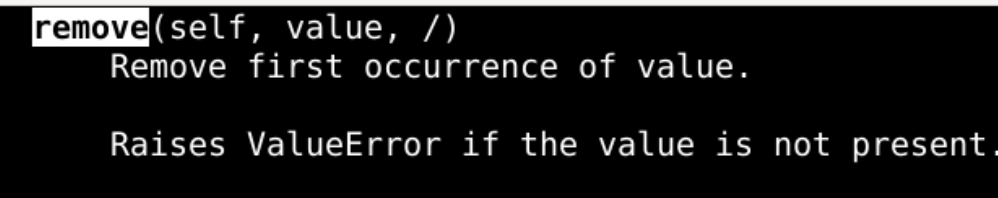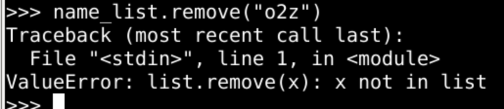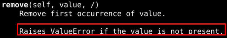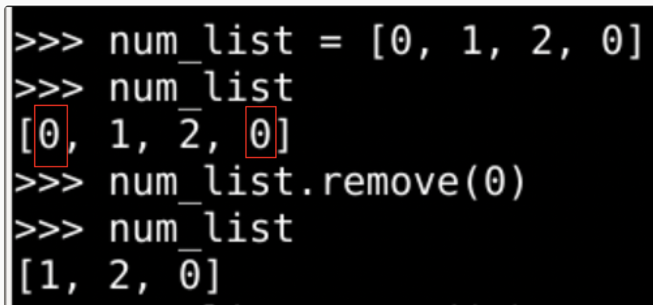 Raises ValueError num_list = [0, 1, 2, 0] num_list.remove(3)