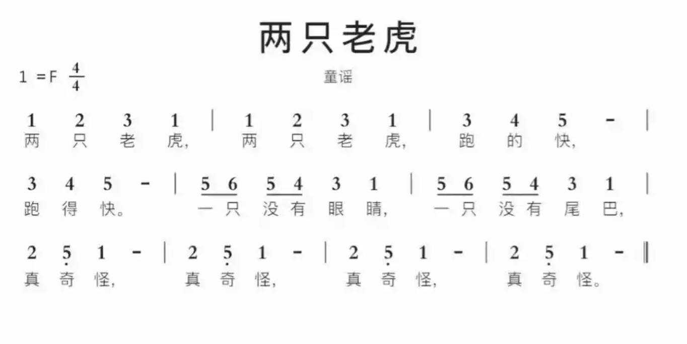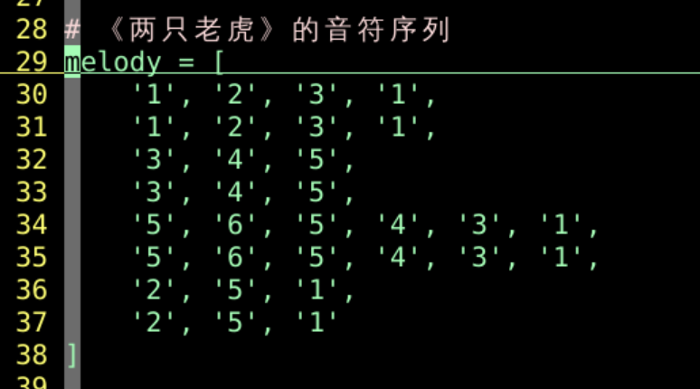 # 《两只老虎》的音符序列 melody = [ '1', '2', '3', '1',... ]