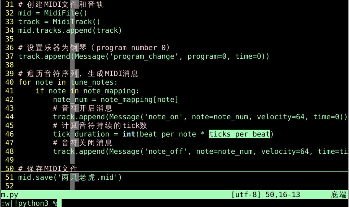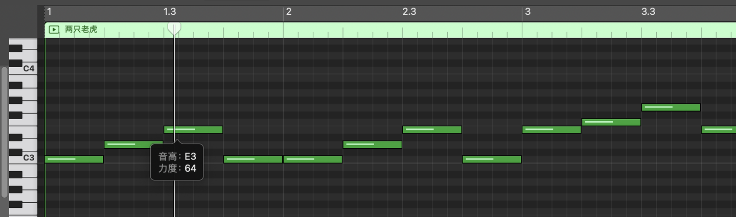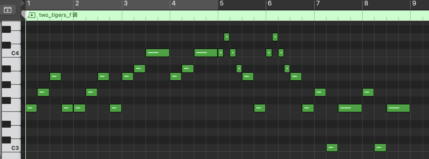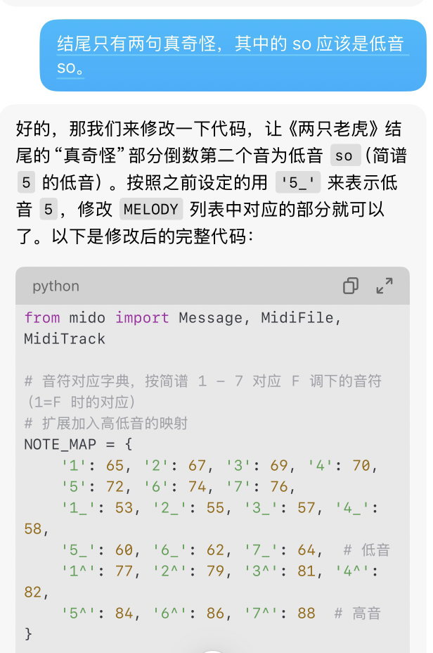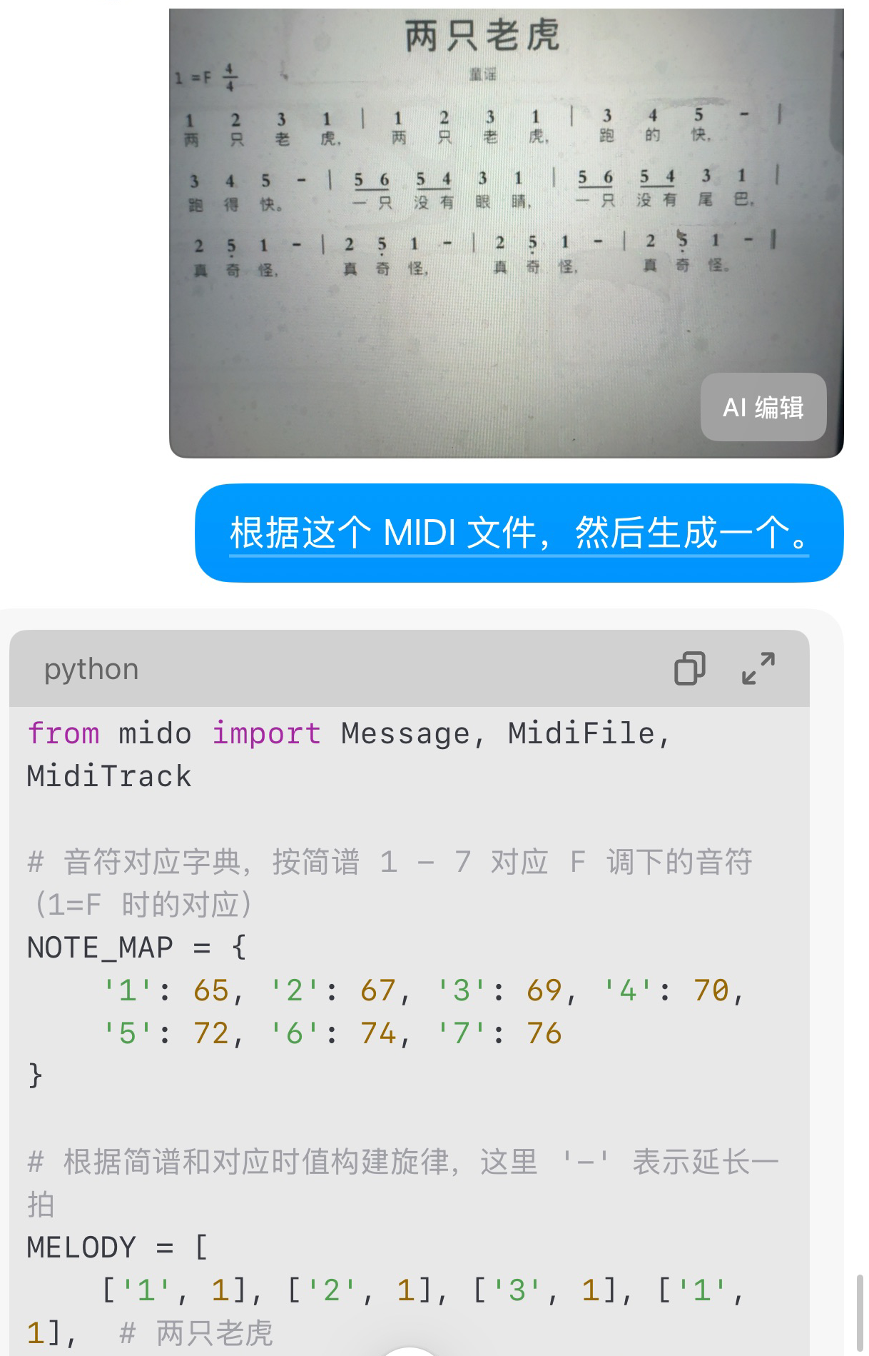 # 遍历音符序列,生成MIDI消息 for note in tune_notes: if note in note_mapping: note_num = note_mapping[note] # 音符开启消息 track.append(Message('note_on', note=note_num, velocity=64, time=0)) # 计算音符持续的tick数 tick_duration = int(beat_per_note * ticks_per_beat) # 音符关闭消息 track.append(Message('note_off', note=note_num, velocity=64, time=tick_duration)) # 保存MIDI文件 mid.save('两只老虎.mid')
