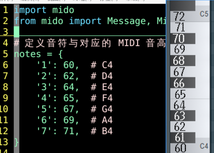 # 创建MIDI文件和音轨 mid = MidiFile() track = MidiTrack() mid.tracks.append(track) # 设置乐器为钢琴(program number 0) track.append(Message('program_change', program=0, time=0))