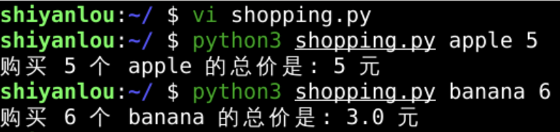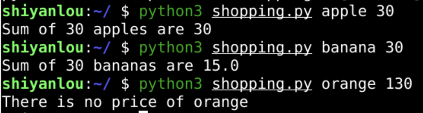 python3 shopping.py apple 3 python3 shopping.py banana 5