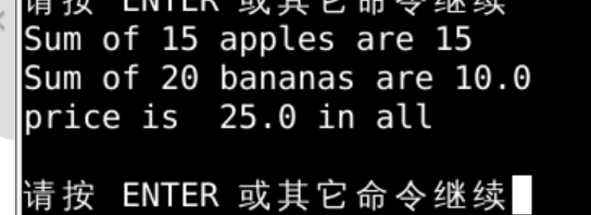 import sys if len(sys.argv) not in [3, 5]: print("请按正确格式输入:python 脚本名.py <水果类型> <数量> 或者 python 脚本名.py <水果1类型> <水果1数量> <水果2类型> <水果2数量>") sys.exit(1) total_price = 0 if len(sys.argv) == 3: fruit = sys.argv[1].lower() try: quantity = int(sys.argv[2]) except ValueError: print("数量参数必须是整数") sys.exit(1) if fruit == "apple": total_price = quantity * 1 elif fruit == "banana": total_price = quantity * 0.5 else: print("不支持的水果类型,仅支持 apple 或 banana") sys.exit(1) else: fruit1 = sys.argv[1].lower() try: quantity1 = int(sys.argv[2]) except ValueError: print("第一个水果的数量参数必须是整数") sys.exit(1) fruit2 = sys.argv[3].lower() try: quantity2 = int(sys.argv[4]) except ValueError: print("第二个水果的数量参数必须是整数") sys.exit(1) if fruit1 == "apple": total_price += quantity1 * 1 elif fruit1 == "banana": total_price += quantity1 * 0.5 else: print(f"不支持的水果类型 {fruit1},仅支持 apple 或 banana") sys.exit(1) if fruit2 == "apple": total_price += quantity2 * 1 elif fruit2 == "banana": total_price += quantity2 * 0.5 else: print(f"不支持的水果类型 {fruit2},仅支持 apple 或 banana") sys.exit(1) print(f"购买水果的总价是: {total_price} 元")