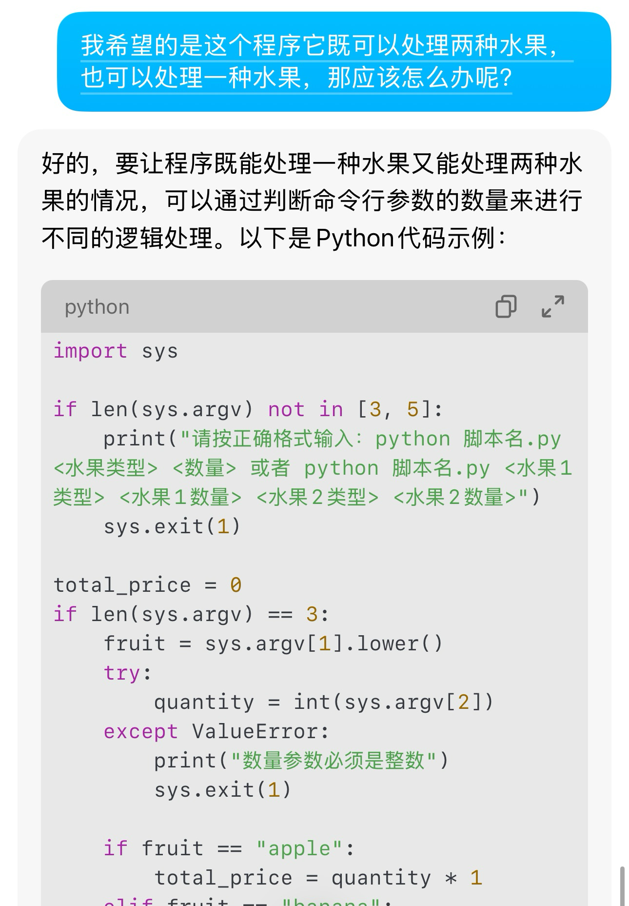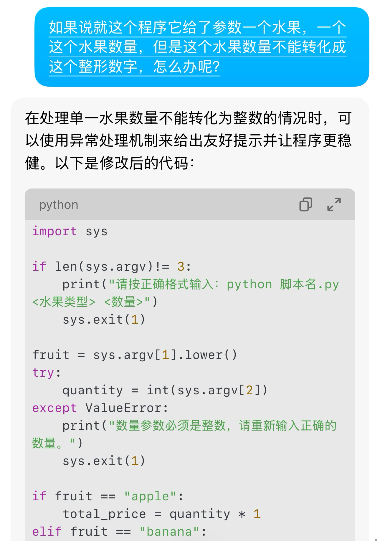if len(sys.argv) != 3: print("请按正确格式输入:python 脚本名.py <水果类型> <数量>") sys.exit(1)