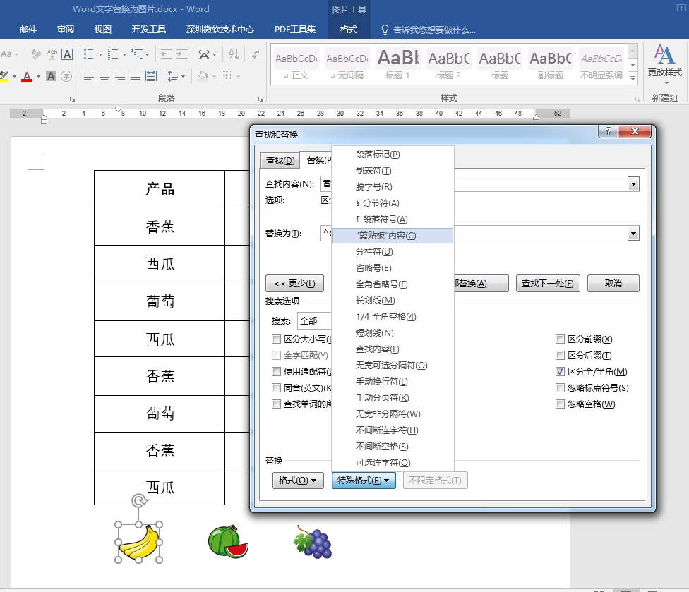 5.单击“全部替换”,香蕉就替换为对应的香蕉图片了。西瓜、葡萄是一样的方法哦!