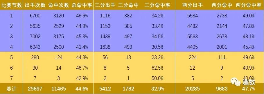 常规时间内,第一节和第三节出手次数相对较多,随着比赛进行,三分球出手次数越来越多