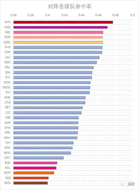 如此强劲的对手,自然成为了各个对手球队重点照顾的对象。从图表顶部和底部命中率对比相差近十个百分点。