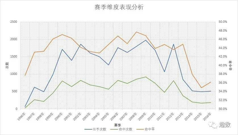 从1996年进入NBA,前几个新秀赛季有一个菜鸟起飞的上升趋势,逐渐成为球队主要的火力输出,伴随着的是出手次数和命中率的提升,而后十多个赛季,偶有的低谷期波动主要是由于伤病所致缺赛的影响。