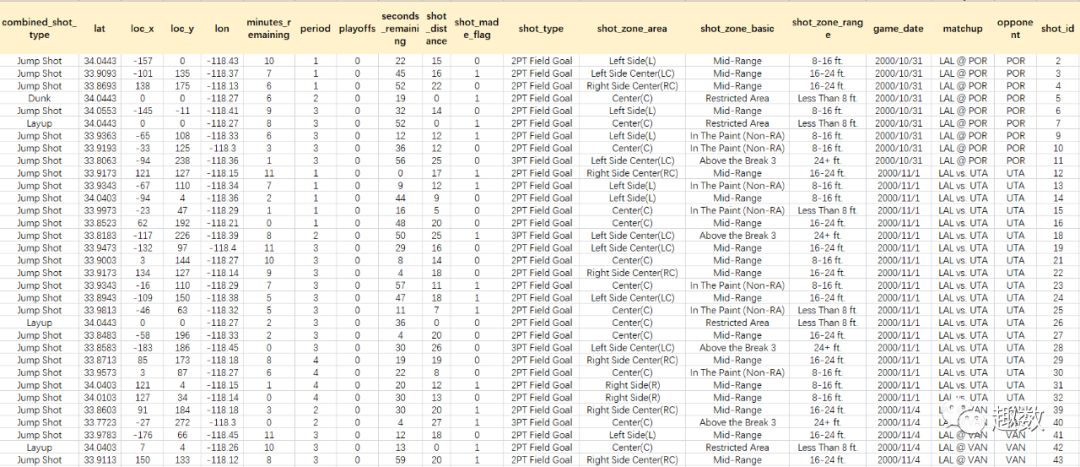 数据集格式为csv,文件大小为6M,里面的包括行为动作、组合动作、动作的坐标位置、命中情况、对阵球队等二十多个字段。