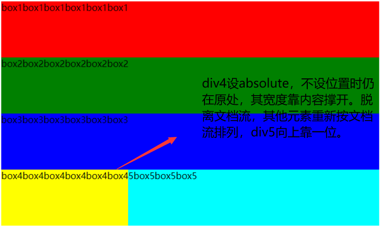 absolute:定位是相对于离元素最近的设置了绝对或相对定位的父元素决定的,如果没有父元素设置绝对或相对定位,则元素相对于根元素即html元素定位。设置了absolute的元素脱了了文档流,元素在没有设置宽度的情况下,宽度由元素里面的内容决定。脱离后原来的位置相当于是空的,下面的元素会来占据位置。