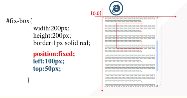 fixed:固定定位,或称为相对于浏览器窗口的绝对定位,脱离文档流。