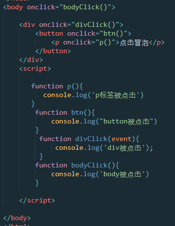 正如上面我们所说的,它会从一个最具体的的元素接收,然后逐级向上传播, p=>button=>div=>body..........事件冒泡可以形象地比喻为把一颗石头投入水中,泡泡会一直从水底冒出水面。