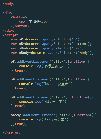 正如我们看到的,和冒泡流完全相反,从最不具体的元素接收到最具体的元素接收事件 body=>div=>button=>p