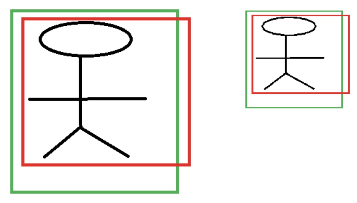 为什么这里要用\(P_{w}t_{x}\)的形式而不是直接用一个变量\(O_{x}\)表示平移量(等价于为什么需要除以\(P_{w}\)),主要原因就在于需要保持尺度不变性。如下图所示,假如图片中有两个大小不一样的人,网络需要能将他们都判断为人,则其对应特征\(\phi_{1}=\phi_{2}\),如果我们直接学习坐标差值,以x坐标为例,学习到的映射分别为\(t_{x1}=f(\phi_{1})=x_{1}-p_{1}\)和\(t_{x2}=f(\phi_{2})=x_{2}-p_{2}\),很明显两者的值不相等,也就是同一个x对应不同的y,这显然不满足函数定义。