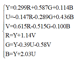 YUV模型是电视信号系统所采用的颜色编码方式。这三个变量分别表示是像素的亮度(Y)以及红色分量与亮度的信号差值(U)和蓝色与亮度的差值(V)。这种颜色模型主要用于视频和图像的传输,该模型的产生与电视机的发展历程密切相关。由于彩色电视机在黑白电视机发明之后才产生,因此用于彩色电视机的视频信号需要能够兼容黑白电视机。彩色电视机需要三个通道的数据才能显示彩色,而黑白电视机只需要一个通道的数据即可,因此为了使视频信号能够兼容彩色电视与黑白电视,将RGB编码方式转变成YUV的编码方式,其Y通道是图像的亮度,黑白电视只需要使用该通道就可以显示黑白视频图像,而彩色相机通过将YUV编码转成RGB编码方式,便可以在彩色电视种显示彩色图像,较好的解决了同一个视频信号兼容不同类型电视的问题。RGB模型与YUV模型之间的转换关系如式所示,其中RGB取值范围均为0-255。