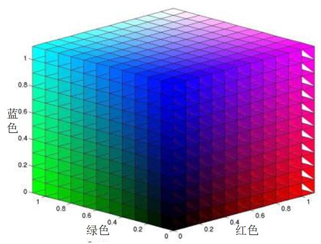 RGB颜色模型的命名方式是采用三种颜色的英文首字母组成,分别是红色(Red)、绿色(Green)和蓝色(Blue)。虽然该颜色模型的命名方式是红色在前,但是在OpenCV中却是相反的顺序,第一个通道时蓝色(B)分量,第二个通道时绿色(G)分量,第三个通道时红色(R)分量。根据存储顺序的不同,OpenCV 4中提供了这种顺序的反序格式,用于存储第一个通道是红色分量的图像,但是这两种格式的图像的颜色空间是相同的,颜色空间如图3-1所示。三个通道对于颜色描述的范围是相同的,因此RGB颜色模型的空间构成是一个立方体。在RGB颜色模型中,所有的颜色都是由这三种颜色通过不同比例的混合得到,如果三种颜色分量都为0,则表示为黑色,如果三种颜色的分量相同且都为最大值,则表示为白色。每个通道都表示某一种颜色由0到1的过程,不同位数的图像表示将这个颜色变化过程细分成不同的层级,例如8U3C格式的图像每个通道将这个过程量化成256个等级,分别由0到255表示。在这个模型的基础上增加第四个通道即为RGBA模型,第四个通道表示颜色的透明度,当没有透明度需求的时候,RGBA模型就会退化成RGB模型。