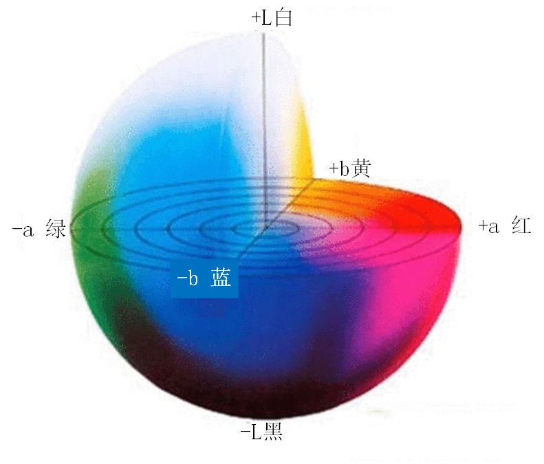 Lab颜色模型弥补了RGB模型的不足,是一种设备无关的颜色模型,是一种基于生理特征的颜色模型。在模型中L表示亮度(Luminosity),a和b是两个颜色通道,两者的取值区间都是由-128到+127,其中a通道数值由小到大对应的颜色是从绿色变成红色,b通道数值由小到大对应的颜色是由蓝色变成黄色。其构成的颜色空间是一个球形。