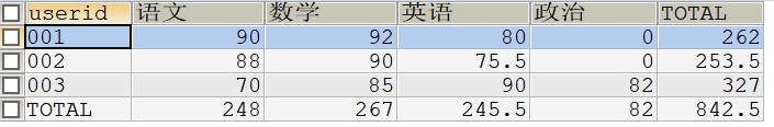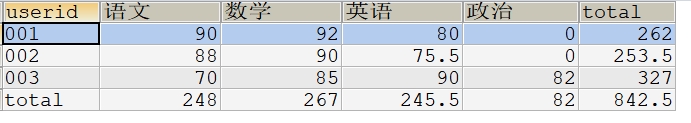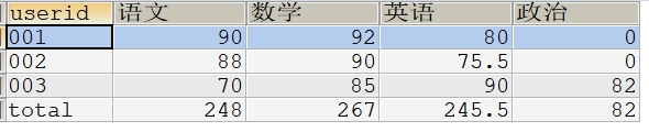SELECT userid,IFNULL(`subject`,'total') AS `subject`,SUM(score) AS score