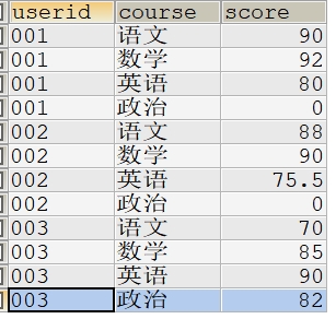 INSERT INTO tb_score(userid,SUBJECT,score) VALUES ('003','政治',82);