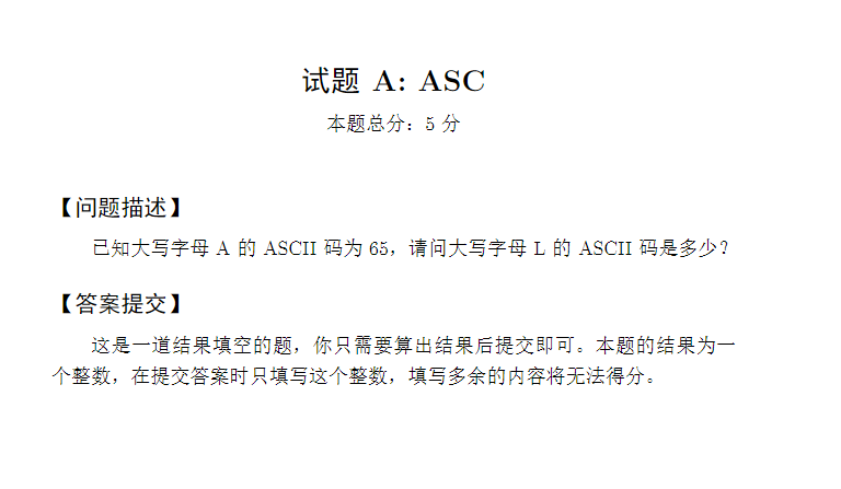 已知大写字母 A 的 ASCII 码为 65,请问大写字母 L 的 ASCII 码是多少?