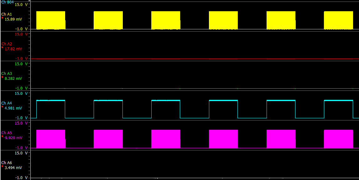 1 把BLDC电机绕组当成蜂鸣器,产生蜂鸣音时,测得的驱动波形为 u,w上桥发出PWM时,v相下桥同时变高,其他任何时候,任何相都是低。